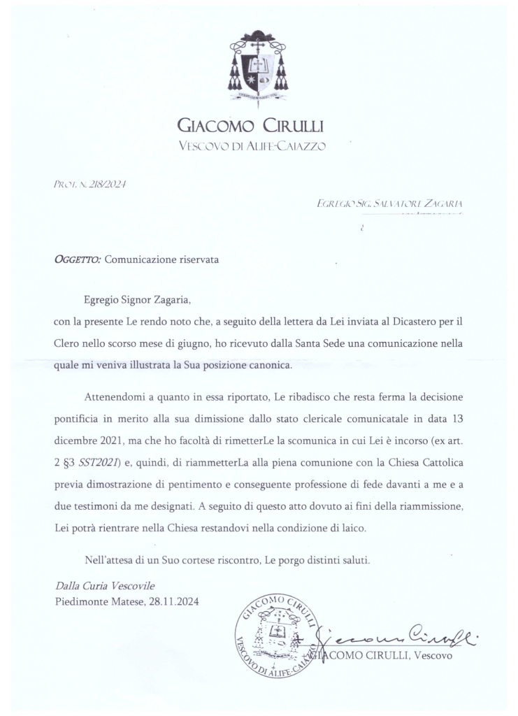 Nello spirito della comunione ecclesiale, si accoglie la notizia della recente revoca della scomunica latae sententiae – come previsto dal Codice di Diritto Canonico – avvenuta in altra Diocesi italiana. Già nel novembre 2024 il Vescovo di Alife-Caiazzo S. E. Mons. Giacomo Cirulli – in ottemperanza alle disposizioni della Santa Sede pervenute in Diocesi nell’ottobre 2024 – comunicava all’ex sacerdote Zagaria la possibilità di ritornare alla comunione ecclesiale. Cosa che avviene con un atto di pentimento formale da parte dell’interessato da manifestare davanti alla Chiesa in particolare all’Ordinario del luogo che ne attesta la veridicità. Alla richiesta del vescovo Giacomo Cirulli, come si evince dal documento allegato (raccomanda A/R del 14.12.2024) non seguiva da parte del sig. Salvatore Zagaria alcuna risposta.