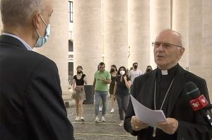 Al giornalista del Tg2, Enzo Romeo, Mons. Galantino mostra il recente versamento all’Agenzia delle Entrate di oltre 3 milioni di euro e anticipa la notizia della pubblicazione del bilancio dell’APSA perché a tutti possa essere chiara la gestione patrimoniale della Chiesa.
