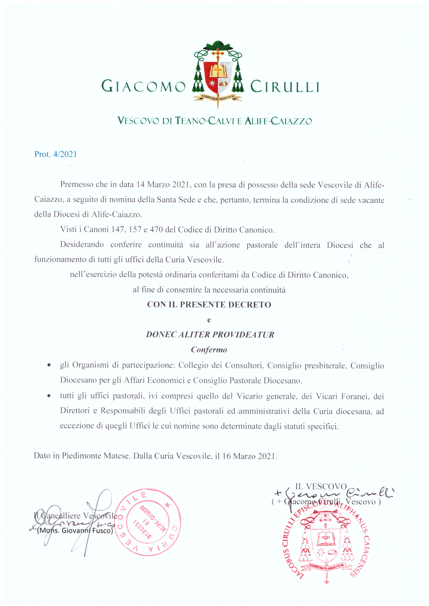 Con il Decreto n. 4/2021 il Vescovo S. E. Mons. Giacomo Cirulli ha confermato: